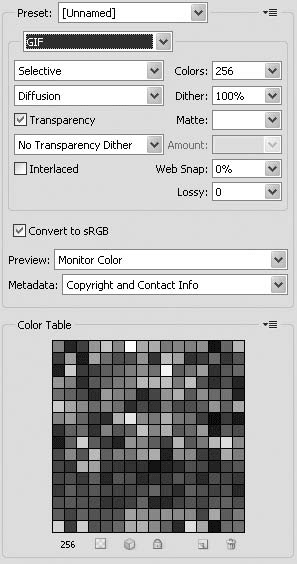Если изображение четкое и контрастное, программа автоматически подберет для файла минимально возможное количество цветов. Чтобы убедиться в этом, обратите внимание на поле Color Table (Цветовая таблица) под настройками формата. Для четкого черно-белого рисунка будут присутствовать 2–4 оттенка, даже если в поле Colors (Цвета) введено 256.