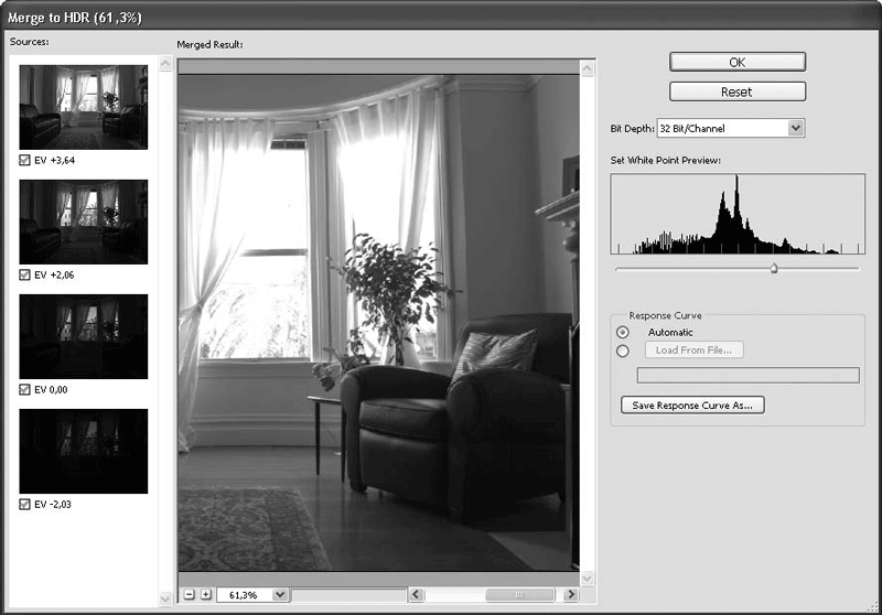 Рис. 5.11. Окно настроек Merge to HDR (Объединить в HDR)
