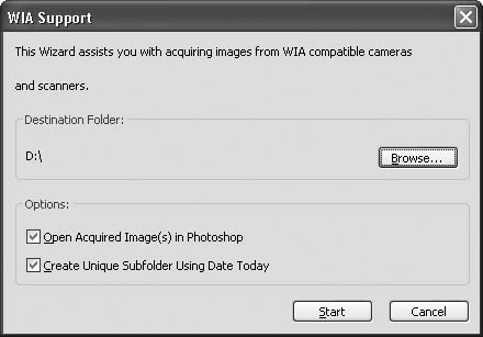 Чтобы начать сканирование, выполните в Photoshop команду File → Import → WIA Support (Файл → Импорт → Поддержка WIA). Если сканер подключен, то появится диалоговое окно (рис. 6.1), в котором нужно указать место для сохранения отсканированных изображений и нажать кнопку Start (Старт).