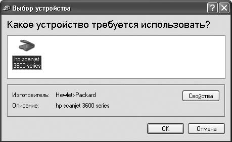 После этого появится окно Выбор устройства (рис. 6.2), в котором следует указать нужный сканер и нажать кнопку OK. Дальнейшие действия зависят от конкретной модели устройства и соответственно утилиты сканирования.
