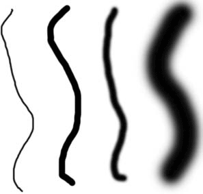 На рис. 6.20 изображены линии, проведенные инструментом Brush (Кисть) с различными параметрами кисти.