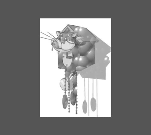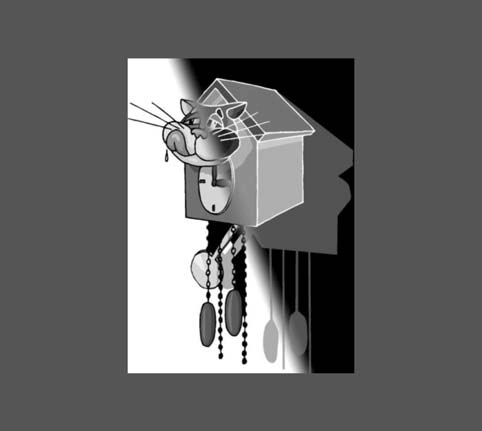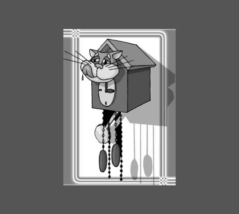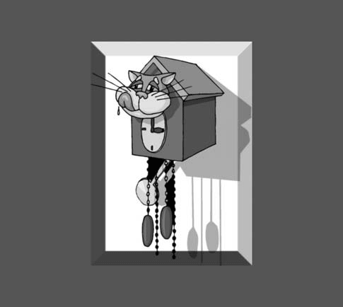 Приведем пример простого использования маски. Пусть у нас есть изображение с двумя слоями, где нижний слой – серый фон, а верхний – рисунок часов с котом (см. рис. 9.13).