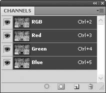 Для просмотра каналов используется палитра CHANNELS (Каналы) (рис. 9.26). С ее помощью можно отключать отдельные каналы. Делается это точно так же, как и в случае со слоями, – для отключения канала необходимо щелкнуть на значке в виде глаза возле его названия. Черно-белое изображение, которое можно наблюдать в цветовом канале, означает следующее: темные участки показывают отсутствие цвета, а светлые – его наличие.