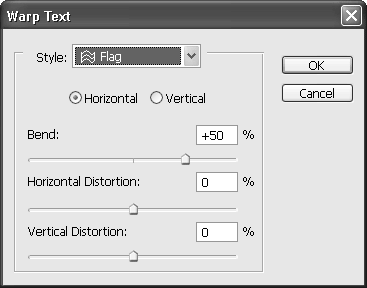 С помощью настроек окна Warp Text (Деформация текста) (рис. 9.38), которое появляется после ее нажатия, можно деформировать текст: например, делать его волнистым или сжатым по краям (рис. 9.39).