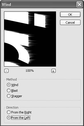 Примените фильтр Wind (Ветер): Filter → Stylize → Wind (Фильтр → Стилизация → Ветер) (рис. 10.2). Именно для того, чтобы применить данный фильтр, и необходимо было вращать изображение. Настройки фильтра установите следующие: Method (Метод) — Wind (Ветер), Direction (Направление) — From the Left (Слева).