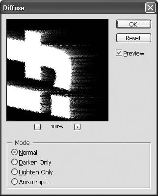 Теперь нам понадобится фильтр Diffuse (Диффузия): Filter → Stylize → Diffuse (Фильтр → Стилизация → Диффузия) (рис. 10.4). Он создает эффект диффундирующих цветов: цвета от язычков пламени проникают в цвет фона и наоборот. Установите переключатель в области Mode (Режим) в положение Normal (Обычный).