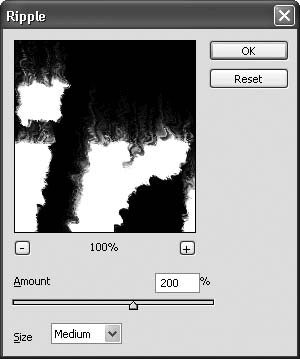 Сейчас следует немного оживить пламя, придать ему движение. Для этого воспользуемся фильтром Ripple (Рябь): Filter → Distort → Ripple (Фильтр → Деформация → Рябь). Мы советуем выбрать средний (Medium) размер (Size) ряби и установить значение параметра Amount (Величина) равным 200 % (рис. 10.6).