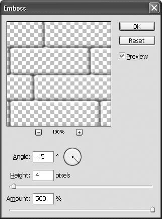 Для придания цементу естественного вида, то есть объема, воспользуемся фильтром Emboss (Барельеф): Filter → Stylize → Emboss (Фильтр → Стилизация → Барельеф). Настройки, примененные нами, приведены на рис. 10.33. Однако значение параметра Angle (Угол) лучше подобрать индивидуально – он указывает, откуда должен исходить свет для получения эффекта рельефности.