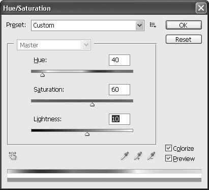 Осталось только окрасить взрыв. Сведите слои (Ctrl+E) и выполните команду Image → Adjustments → Hue/Saturation (Изображение → Коррекция → Оттенок/ Насыщенность) с настройками, показанными на рис. 10.44.