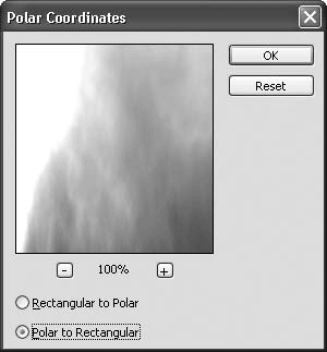 Но можно пойти еще дальше и из рис. 10.46 сделать очень реалистичный огонь. Запустите фильтр Filter → Distort → Polar Coordinates (Фильтр → Деформация → Полярные координаты) с настройками, показанными на рис. 10.47.