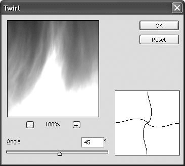Приведем огонь в движение. Для этого применим фильтр Twirl (Скручивание): Filter → Distort → Twirl (Фильтр → Деформация → Скручивание) с настройками, показанными на рис. 10.49.