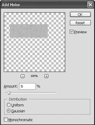 Залейте созданное выделение оранжевым цветом с помощью инструмента Paint Bucket (Заливка) (горячая клавиша — G). Для имитации неоднородности структуры следует добавить немного шума: Filter → Noise → Add Noise (Фильтр → Шум → Добавить шум) (рис. 10.51). Силу действия (Amount) следует установить небольшую, так как в данном случае шум используется для придания правдоподобности. В нашем примере значение Amount (Величина) равно 6 %. Обратите внимание, что флажок Monochromatic (Монохромный) снят.