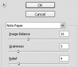 Установите в качестве основных цветов черный и белый, нажав клавишу D, и воспользуйтесь фильтром Note Paper (Почтовая бумага): Filter → Sketch → Note Paper (Фильтр → Набросок → Почтовая бумага) (рис. 10.52). В приведенном примере заданы следующие значения параметров фильтра: Image Balance (Баланс изображения) – 16, Graininess (Зернистость) – 3, Relief (Рельеф) – 4.