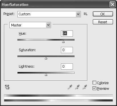 В этом примере мы покажем два способа изменения цвета глаз. В первом попробуем изменить оттенок на зеленый. Для этого запустите цветокорректирующий инструмент Hue/Saturation (Оттенок/Насыщенность): Image → Adjustments → Hue/Saturation (Изображение → Коррекция → Оттенок/ Насыщенность) и примените его с параметрами, показанными на рис. 10.64.