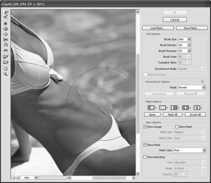 Когда маска будет готова, вернитесь к инструменту Bloat (Раздуть) и увеличьте правую грудь. Здесь нужно работать очень осторожно – даже небольшое несоблюдение пропорциональности будет заметно. Затем можно нажать кнопку OK, закончив тем самым работу с Liquify (Разжижение).