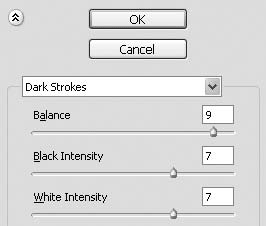 Дублируйте слой с девушкой, перетянув его на палитре LAYERS (Слои) на пиктограмму в виде чистого листа бумаги. Затем выполните команду Filter → Brush Strokes → Dark Strokes (Фильтр → Штрихи кисти → Темные штрихи) с настройками, показанными на рис. 10.70.