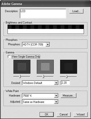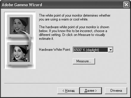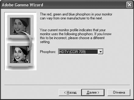 • Adobe Gamma – удобная, но не вполне профессиональная программа. В умелых руках она может обеспечить до 80 % соответствия цветов, но не более. Большую точность можно получить только с помощью всякого рода дорогостоящих устройств.