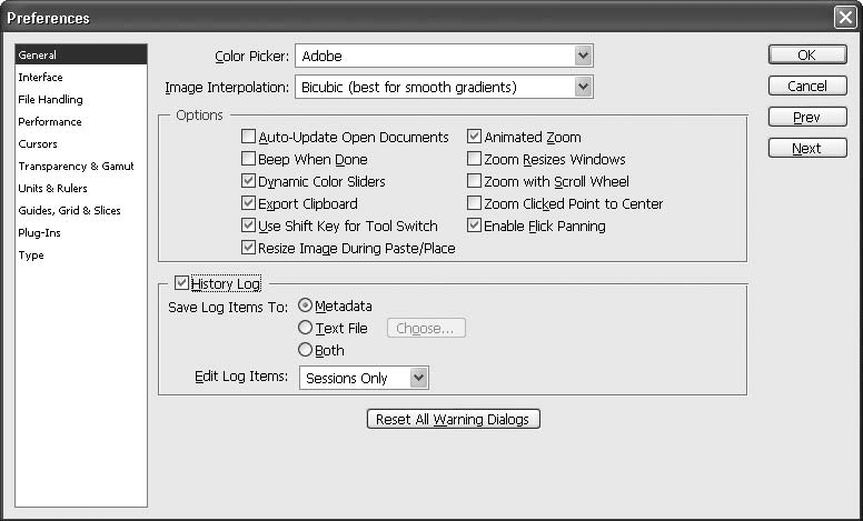 Окно Preferences (Установки) имеет несколько вариантов. Переключаться между ними можно нажатием кнопок Prev (Предыдущий) и Next (Следующий) или выбирая нужный пункт списка в левой части окна. Установок довольно много, не все из них вам понадобятся. Остановимся только на тех, которые важны для эффективного использования памяти компьютера и обеспечения удобства работы.