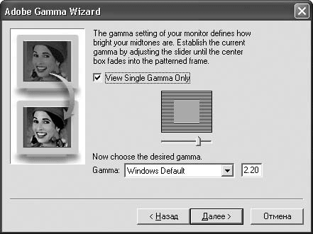 Возьмем какую-нибудь фотографию и распечатаем ее. Различия будут видны невооруженным глазом. Как правило, на мониторе изображение гораздо ярче и насыщеннее. Часто различается и оттенок: на экране все красноватое, а на бумаге синеватое или зеленоватое. Могут быть и другие отличия по цвету. Чтобы компенсировать их, запускаем Adobe Gamma. Можно сразу в варианте Control Panel (Панель управления) (рис. 2.7).