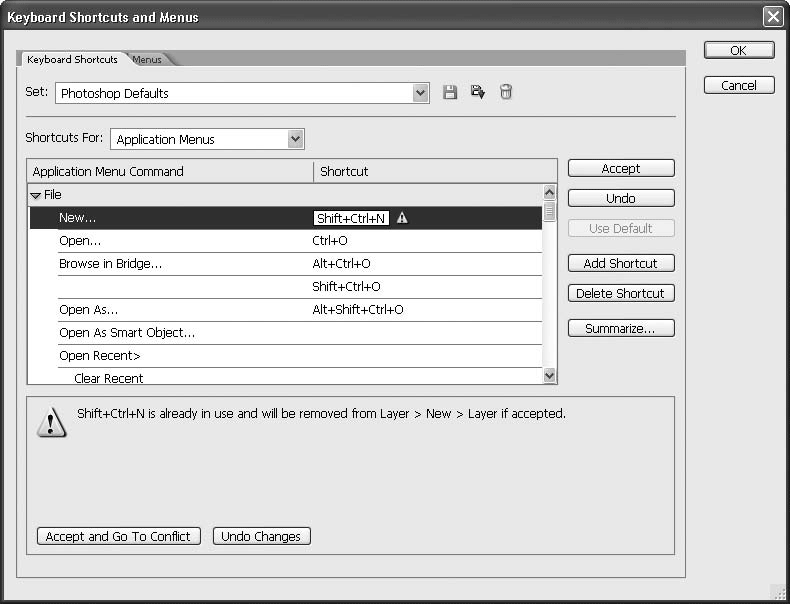 Допустим, вы решили изменить сочетание клавиш для команды File → New (Файл → Создать). Выберите в списке пункт Application Menus (Главное меню программы), а под ним в столбце Application Menu Command (Команда главного меню программы) откройте пункт File (Файл) – для этого достаточно на нем дважды щелкнуть. Затем щелкните напротив пункта New (Новый) в столбце Shortcut (Клавиатурное сокращение), в результате поле станет доступным для редактирования (замигает курсор). Нажмите новое сочетание клавиш.