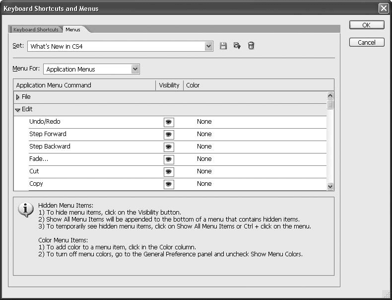 Данная возможность появилась относительно недавно, в версии CS2. Она позволяет изменить состав и оформление главного меню программы, а также меню палитр. Допустим, вам надоело путешествовать по длинным спискам команд, большинство из которых никогда вам не понадобится. Теперь вы можете отключить все ненужное и получить компактное, удобное меню. Другой пример – необходимо быстро увидеть и оценить все нововведения CS4. Достаточно загрузить набор настроек What\'s New in CS4 (Что нового в CS4) – и соответствующие пункты меню выделятся синим цветом.