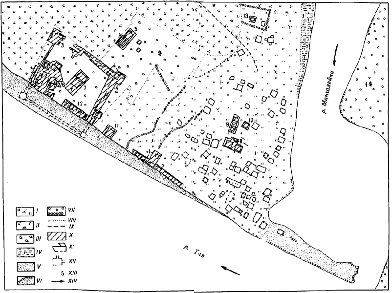 1 — луг с кустами. II — кусты с лишайниковой растительностью, III — редкий лес, IV — заболоченный кустарник, V — песчаная коса, VI — обрывистый берег с земляной осыпью, VII — лес, полоса леса, VIII — граница контуров растительного покрова, IX — тропа (оленья), X — площадь и контур раскопов, XI — задернованные контуры построек, XII — местоположение разрушенных стен и башен, XIII — номер раскопа, XIV — направление течения. Название раскопов: 1 — жилой и торгово-промышленный комплекс зданий (на посаде), 2/6 — комплекс воеводского двора, 3 — угловая Ратиловская башня, 4 — угловая Успенская, Спасская башни и городни, 5 — Успенская церковь, 7 — Троицкая церковь, 8 — медеплавильная мастерская с комплексом жилых построек. 9 — медеплавильная мастерская с комплексом жилых построек, 10 — жилая постройка на посаде, 11 — часовня Василия Мангазейского. 12 — съезжая изба и караульное помещение, 13 — ремесленная постройка на окраине посада Мангазеи.