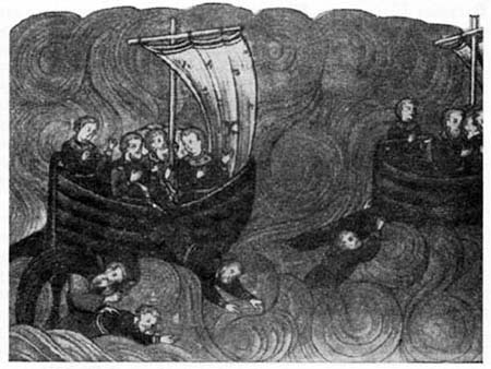 Плавание поморов на лодьях по Белому морю. Миниатюра из Соловецкого патерика XVI в.