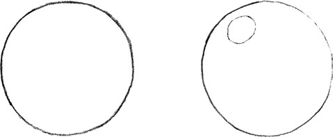 С помощью ЛИНИИ я обозначила основную форму предмета – круг. Как же придать этому плоскому кругу объем? Посмотрите внимательно на свой округлый предмет. Найдите на этом предмете самое светлое местечко – самое светлое ПЯТНО, которое словно отражает свет. Нашли? Я тоже нашла и нарисовала его на своем круге.