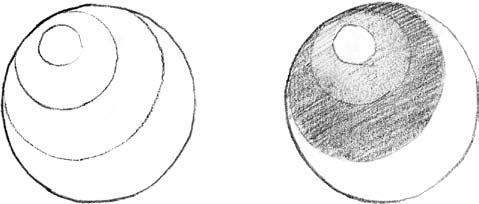 Следующая зона разбивается на ПОЛУТОНА и СОБСТВЕННУЮ ТЕНЬ (рис. 14).Полутона – это плавный переход от света к собственной тени. Иногда полутона делят еще на полусвет и полутень. То есть это пятно не такое светлое, как свет, но и не такое темное, как собственная тень предмета. Обозначим полутона и собственную тень на рисунке. Собственная тень – это самое темное место на предмете (рис. 15).