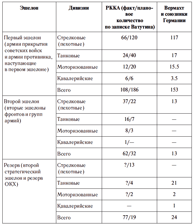 Если оперировать относительными цифрами, то в группировке советских войск было 43 % дивизий в первом эшелоне против 77 % у немцев. Поэтому и выдвигались войска к границе, чтобы вдоль границы СССР с Германией и ее сателлитами были выстроены две примерно равноценные по численности армии, подобно тому, как выстраиваются перед началом партии шахматные фигуры на доске. По записке Ватутина, самому последнему предвоенному документу советского военного планирования, предполагалось собрать против Германии в первом эшелоне 186 дивизий (см. первый раздел таблицы). В приграничных округах было 170 дивизий, включая три дивизии в Крыму. Это означает, что откуда-то нужно взять еще 19 дивизий. 19 июня 1-я тд 1-го мехкорпуса убыла на Кандалакшское направление, и разница составила уже 20 дивизий. Эти 20 дивизий как раз и предполагалось, по записке Ватутина, выдвинуть из внутренних округов: 7 из Приволжского, 7 из Харьковского и 6 из Орловского военных округов. Эти соединения должны были объединяться управлениями 20-й и 21-й армий, которые в реальности до мест назначения доехать не успели и вошли во второй стратегический эшелон. Второй раздел — это резервы фронтов для парирования возможных кризисов, по записке Ватутина — это 22-я армия из Уральского округа за Западным фронтом и 16-я армия (ЗабВО), 19-я армия (СКВО) за Юго-Западным фронтом. Третий раздел — это армии резерва Главного командования, 28-я армия из Архангельского военного округа и 24-я армия, управление которой перебрасывалось из Сибирского военного округа. Для организации такого построения войск и производились перемещения дивизий, корпусов и армий к границе. Армия мирного времени — это разбросанные по всей стране армейские части, для ведения боевых действий их нужно построить в определенном порядке на предполагаемом театре военных действий. Вне зависимости от тех задач, обороны или наступления, которые мы эти войскам ставим.