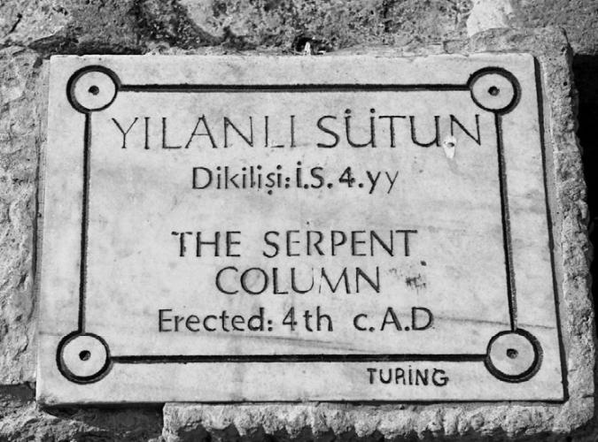 Рис. 22. Табличка, установленная историками возле Змеиной колонны, утверждает, что она была воздвигнута якобы в IV веке н. э. Фотография 2008 года