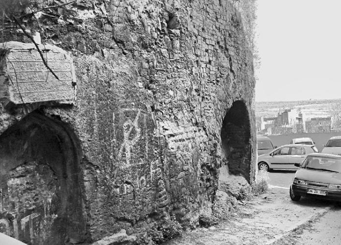 Рис. 31. Стена стамбульского Колизея. Впереди – Мраморное море. На стене висит мраморная доска с надписью. Фотография 2006 года