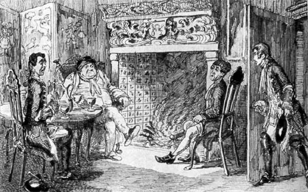 Неожиданный визит Фрэнка Осбальдистона к сквайру Инглвуду. Иллюстрация Джорджа Крукшенка к «Роб Рою».
