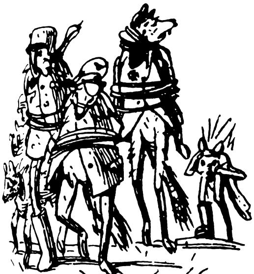 Победа! Победа! Но враг не разбит! Злодей Бармалей за рекою стоит. Он стоит, Бармалей, и позёвывает, На цветы луговые поплёвывает, А слюна у него ядовитая: Где ни плюнет, там змеи и ящерицы. Он стоит со своими удавами, Со своими волками кровавыми. Вкруг него павианы поганые На траве развалилися пьяные. Он стоит над весёлыми сёлами, Над полями стоит он весёлыми И бормочет бессмысленным голосом: «Истребить! Погубить! Уничтожить! Убить! Погубить! Разбомбить! Ни людей, Ни детей — Никого не щадить!» А за ним крокодилы с гориллами, С кабанами его тупорылыми Повторяют и ночью и днём: «Загрызём! Искалечим! Убьём!» 2