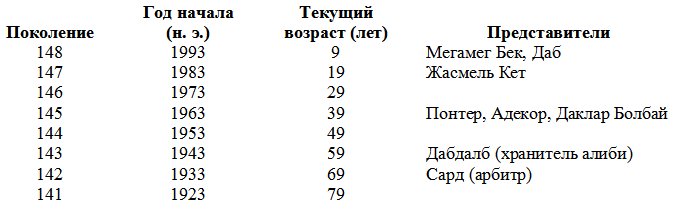 Новое поколение рождается каждые десять лет. Базой для отсчёта поколений служит год, а не месяц, потому что момент зачатия всегда выбирается так, чтобы рождения приходились на весну: у младенца выше шансы выжить, если первую зиму своей жизни он встретит лишь через восемь месяцев после рождения.