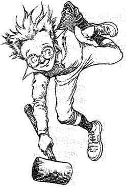 Миссис Флад и Корби подняли головы как раз вовремя, чтобы увидеть пролетающий мимо них деревянный мячик в красно-синюю полоску. За ним, дико хохоча и размахивая молотками, неслись Седрик, Губерт, Эрнест и Тоби. Седрик первым догнал мяч и что есть силы ударил по нему молотком. Мяч с грохотом врезался в металлическую стойку и, отскочив, полетел вертикально вверх.