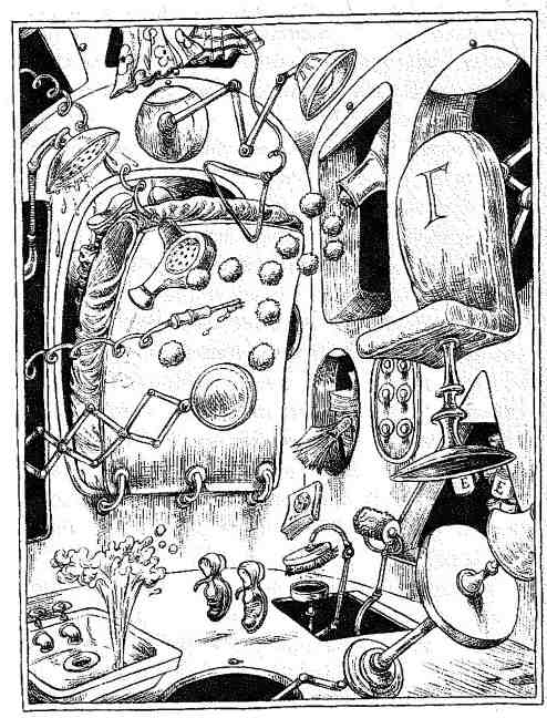 Из другой стенки внезапно выскочили сразу несколько предметов. Среди них была механическая зубная щетка, громко жужжащая и скребущая воздух, фен для волос, попеременно дующий горячим и холодным, и увеличивающее зеркало для бритья, то выезжающее из стены, то втягивающееся обратно на удлиняющемся кронштейне. В зеркале отразилось лицо Корби, на котором застыло ошеломленное выражение.