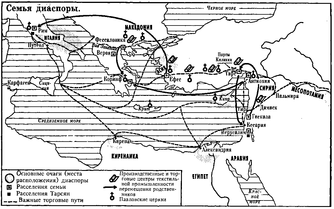 К сожалению, Павел не проливает никакого света на свое происхождение и семейное окружение: в его глазах важно только его иудейство, и притом самое несомненное [24] . Однако намеки в «Посланиях» свидетельствуют о значительности его семьи: у Павла были родственники повсюду: и на Сицилии, и в Македонии, и в Иерусалиме, и в Риме… Таким образом, вырисовывается портрет иудея, принадлежащего к диаспоре, введенной его соплеменниками со времени его рождения в систему деятельности я торговли в международном масштабе.