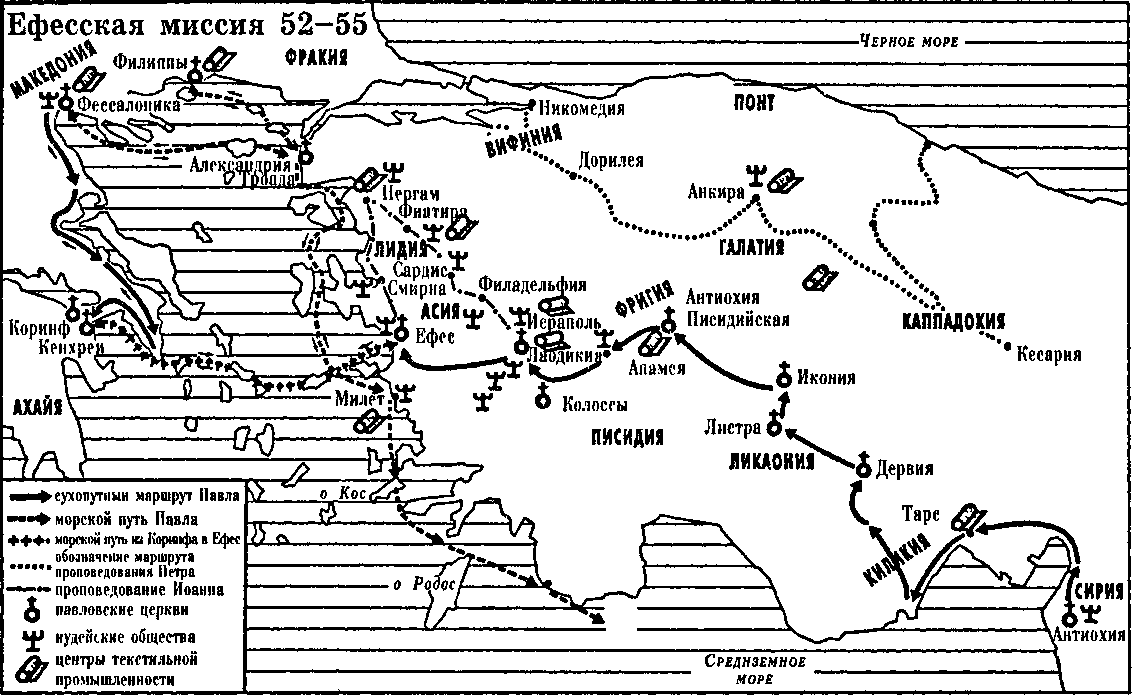 Это вдохновенное решение являлось как бы ответом на известия, полученные от Прискиллы и Акилы, его друзей из Коринфа, которые оставались его верными сторонниками [697] . Они прибыли сюда, чтобы обустроиться в большом порту Азии, так как корабли без конца сновали туда и обратно между двумя берегами Эгейского моря: между берегом с европейской стороны и анатолийским берегом, то есть между Ефесом и Коринфом [698] , между Ефесом и Пирией [699] . Таким образом, Ефес был идеальным пунктом для тех, кто хотел поддерживать регулярные отношения с Македонией и Коринфским перешейком, евангелизированным во время второго путешествия наряду с Тарсом и областями Писидии и Ликаонии. Ефес и в самом деле находился на любом из путей торговцев шерстью, которые отправлялись на поиски пользующихся спросом западнофригийских товаров в долину Ликии, расположенной к востоку от Ефеса, или в Милит — к югу, или же ехали за бархатом в Лидию, бывшую севернее [700] . Павел также направился по дороге торговцев, следуя по одному из важнейших направлений текстильных торговых путей. Можно совершенно точно утверждать, что он отправился в путь из родного дома — из Тарса.