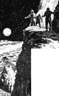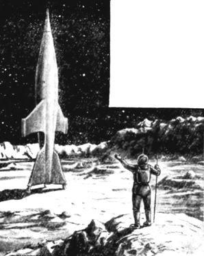 Словно неведомое чудовище, вставшее на дыбы, возвышается посреди лунной пустыни громадный корабль. Сверкают на Солнце глаза-иллюминаторы. Чудовище будто дремлет. Но вот открывается пасть-дверца, и выползает фигура в металлическом панцире, похожая на средневекового рыцаря, но в башмаках на толстой подошве и в прозрачном шлеме.