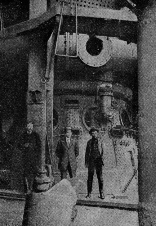 М. К. КУРАКО (крайний справа) у перестроенной им доменной печи. Юзовка, 1912 г.
