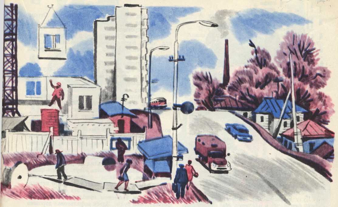 И все же на новом месте Сереге нравилось больше. Здесь полным ходом шла стройка. Тянулись к облакам «небоскребы» по шестнадцать и даже двадцать этажей. К ним подъезжали могучие тягачи. Они везли на прицепах целые стены с окнами, в которые уже были вставлены стекла. Круглые сутки скользили в вышине ажурные стрелы кранов. Ночью, освещая стройку, ярко горели прожекторы, по черному небу рассыпались искры электросварки.