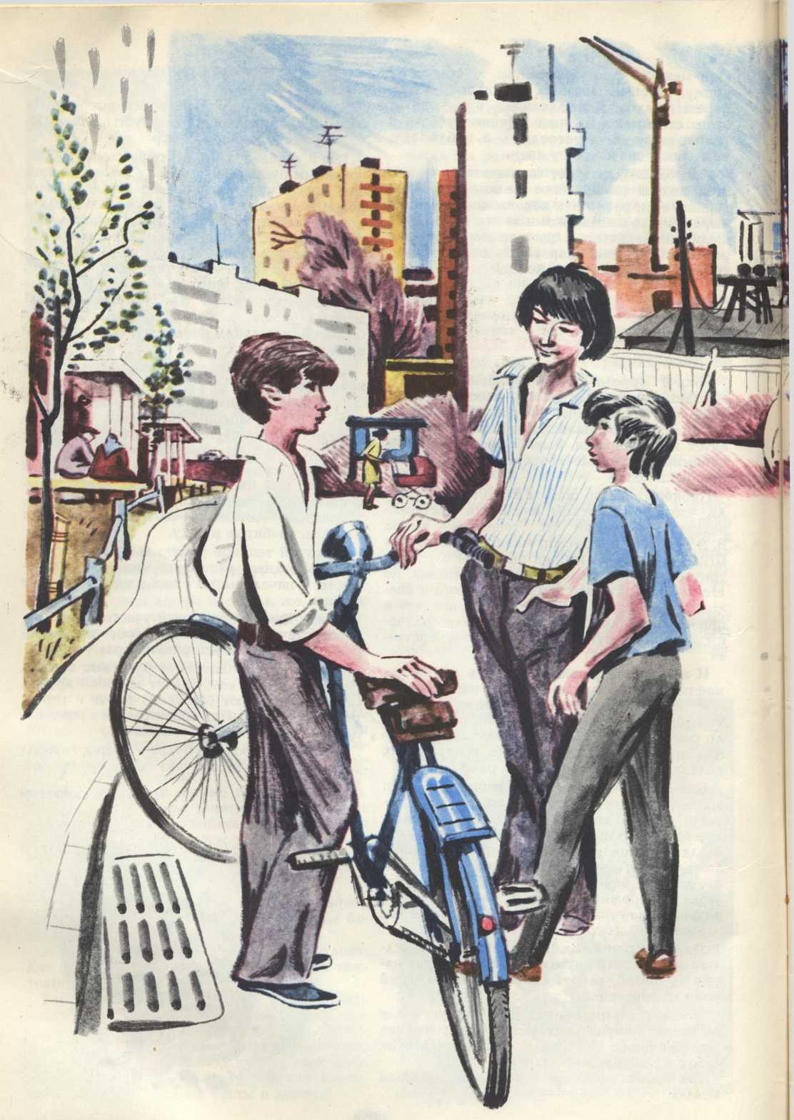 Антон помчался в прихожую, взял велосипед и спустился во двор. Фургон уехал. Мальчишки сидели на скамейке у второго подъезда и играли в значки. Один из них — маленький, белобрысый, в тренировочных штанах и футболке. Второй — постарше, чернявый, в батнике и брюках клеш.