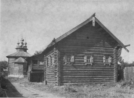 Дом, расположенный слева от архиерейского, носит название братского корпуса (илл. 23). Его первый этаж построен в конце XVI в., второй — в 1758-59 гг. Здесь сейчас помещается исторический раздел музея. В наружной архитектуре его первого этажа хорошо просматривается система планировки. Между пилястрами, отвечающими внутренней капитальной стене, расположены или дверь с окошечком над ней — это сени, или три окна — это палата.