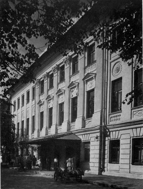 Дом № 7, ныне Дворец пионеров, — один из лучших классических сооружений в городе (илл. 80). Первоначально это был особняк купцов Дурылиных, но в 1830-х гг. он был приобретен костромским дворянством с целью приспособить его под Дворянское собрание. К проектированию был привлечен архитектор Фурсов; его предложения были одобрены в феврале 1837 г. Но окончательную доработку и составление сметы по неизвестным причинам почему-то передали незадолго до этого назначенному на должность городского архитектора Праве. Он в марте того же года представил все требуемые документы, и ему было поручено производство работ. Но Праве не сумел закончить строительство, так как скончался 4 декабря 1837 г. Кто из архитекторов наблюдал за окончанием постройки, неизвестно. Ни один отчет строительной комиссии не дает ответа на этот вопрос. В газетной статье, посвященной открытию клуба, говорится лишь о затруднениях, которые возникли за “неимением архитектора, ибо приглашенный губернский архитектор почти вовсе не занимался постройкой и наконец умер, не окончив работы”. Это свидетельствует о том, что архитектора Праве нельзя считать автором перестройки дома.