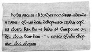 — «Когда растает в воздухе последняя надежда и грянет судный день, доверьтесь сердцу сердца своего. Как вы не видите? Откройте очи душ своих, вот-вот — и колесо судьбы свершит свой оборот».