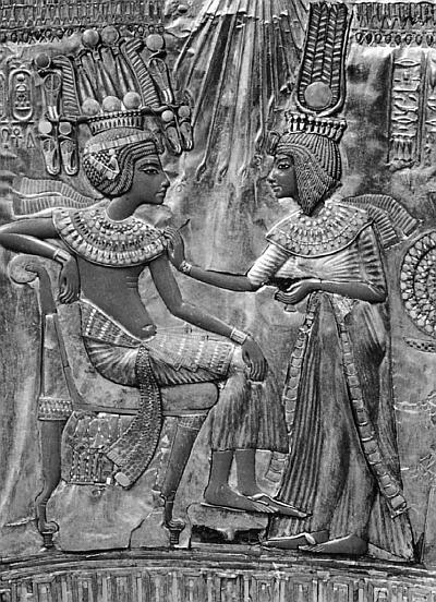 Тутанхамон и Анхесенамон. Фрагмент спинки золотого трона Тутанхамона. XIV в. до н.э.