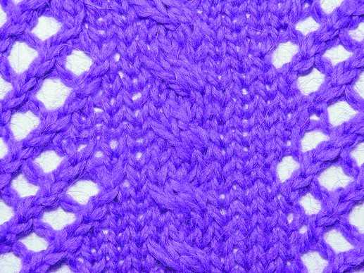 7-й ряд: * 1 лиц. п., 4 п. перекрестить налево (2 п. оставить на вспом. спице перед работой, 2 лиц. п., затем провязать лицевыми 2 п. со вспом. спицы), 3 лиц. п., 2 п. вместе лицевой с наклоном вправо, 1 накид, 2 лиц. п. *, повторять от * до *.
