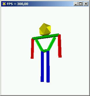 Знаний, которые мы уже получили, достаточно, чтобы создать более-менее интересные построения. Пример - проект каталога Ех05, где рисуется простая модель человечка. Используются две геометрические формы: цилиндр и икосаэдр. С помощью клавиш перемещения курсора конечностями человечка можно управлять, заставляя его поднимать и опускать руки и ноги, но нельзя заставить поднять обе ноги одновременно (рис. 9.7).