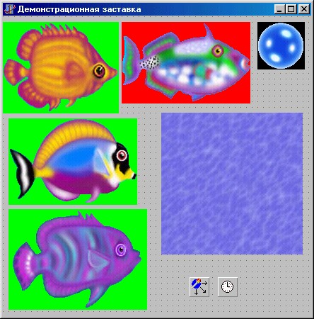 Для загрузки на поверхность образа из компонента класса Timage введена пользовательская функция createFromimage. Рыбки и пузырьки на экране будут иметь случайные размеры, чтобы при использовании цветового ключа не появлялась окантовка. Для корректного масштабирования приходится применять длинную процедуру перекладывания образа на вспомогательные объекты класса TBitMap: